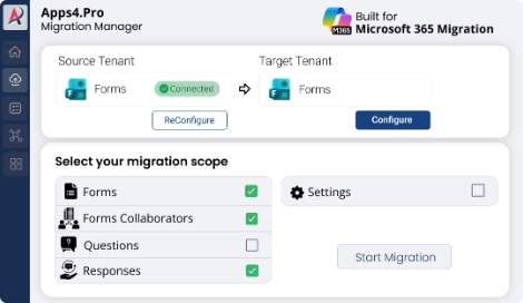 The SaaS-based Microsoft Forms migration tool from Apps4.Pro is the first in the market to support tenant-to-tenant migration, saving countless hours of manual effort. It requires no installation and can be accessed securely from anywhere, at any time.